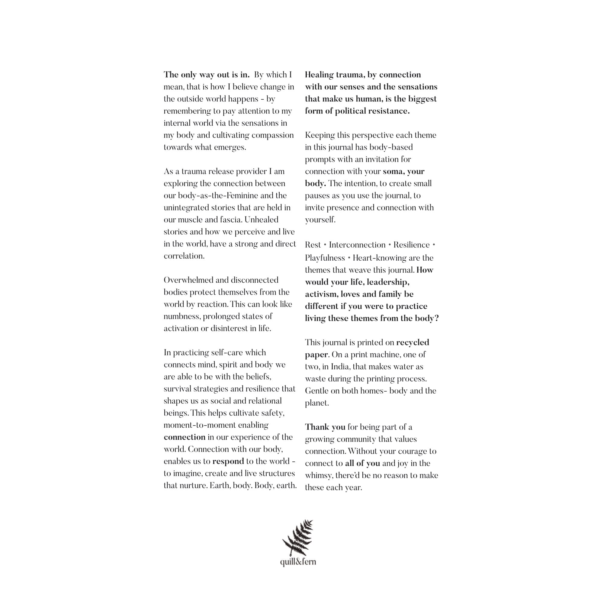 Much has come up to be felt, sifted through and released this year. My focus has been coming back to the basics: listening to the body. The prompts in this version of the journal have come from my training and practice as a TRE® provider. Body and Earth. Earth and Body being extensions of one another.